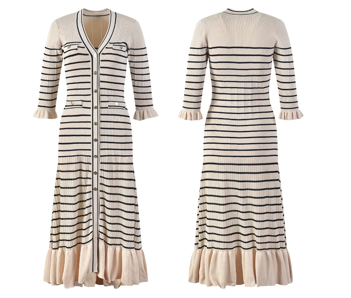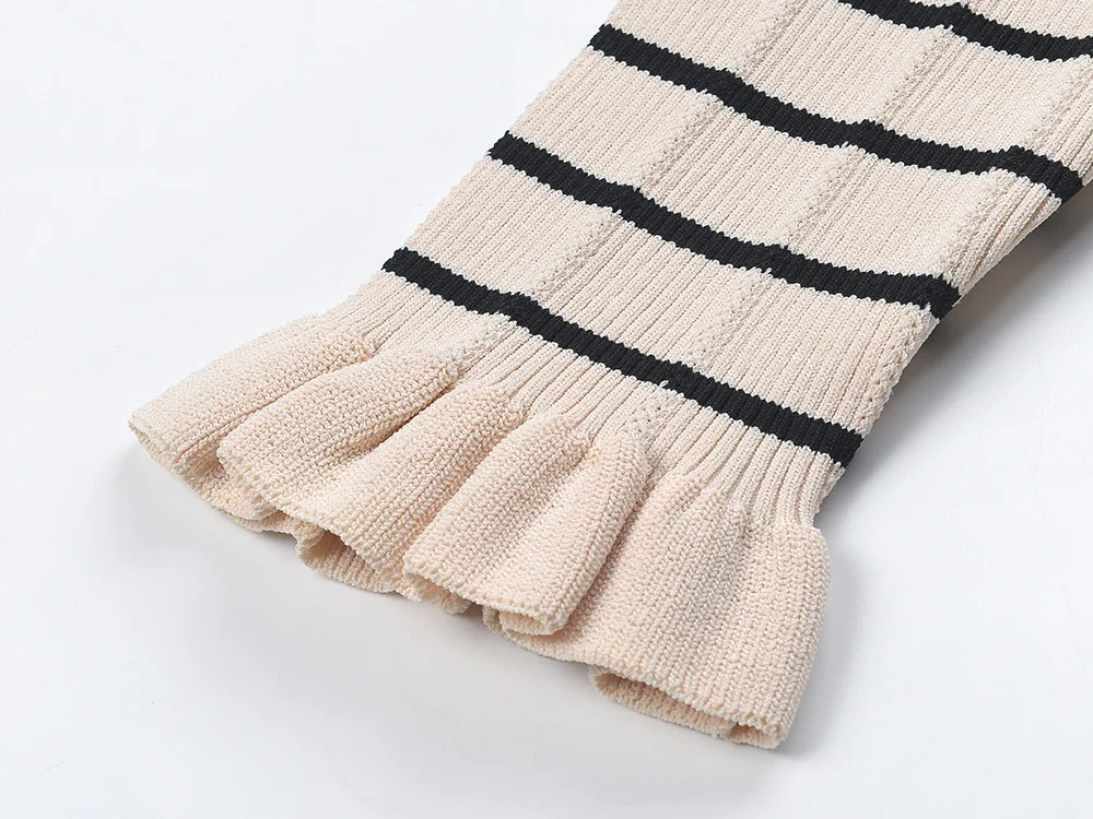 Women Full Long Stripped Knitted Dress V-neck Flare Sleeve Quality Gorgeous Designing