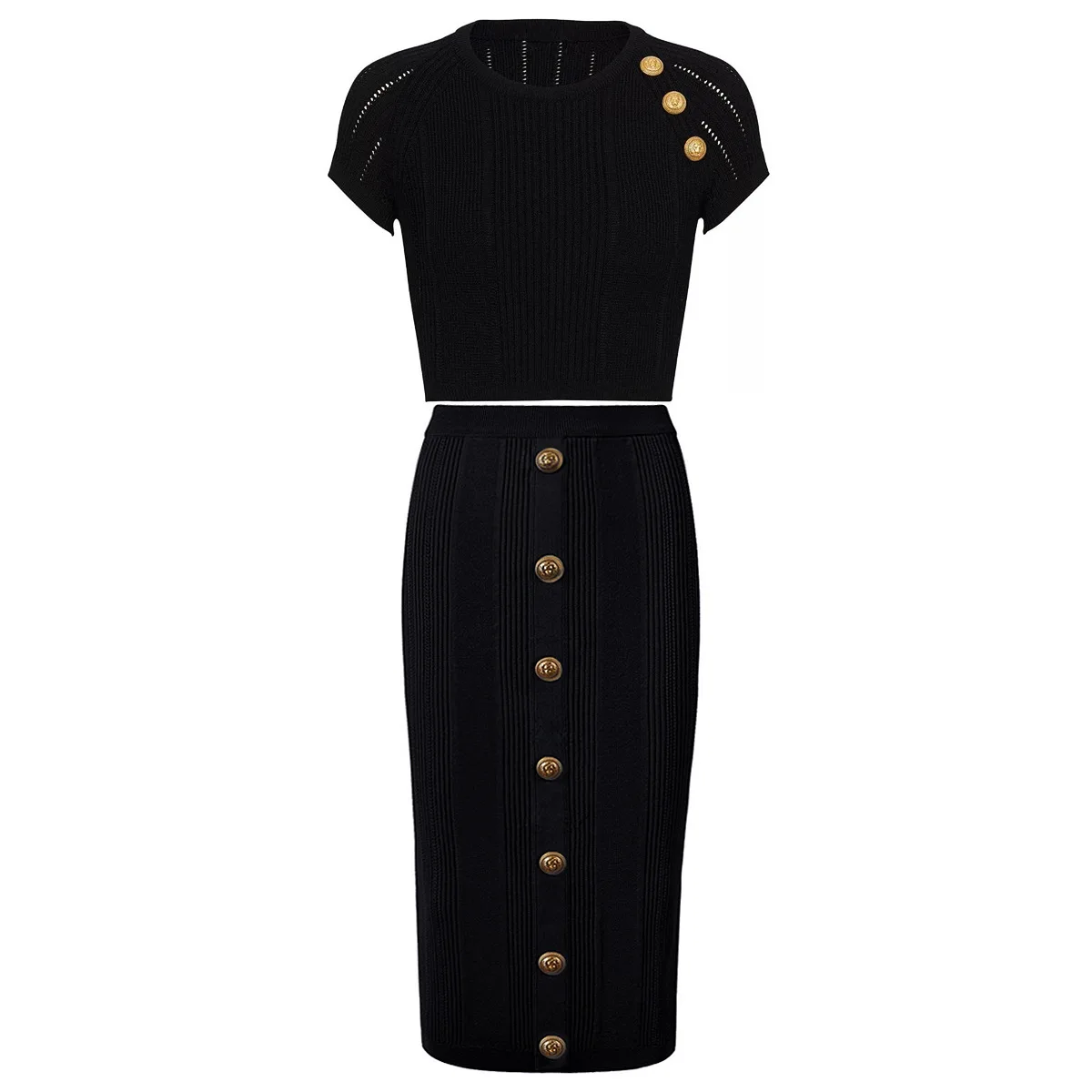 O-neck Short Sleeve Tops Slim Fitted Single-breasted Midi Skirt Women Knits 2Pcs