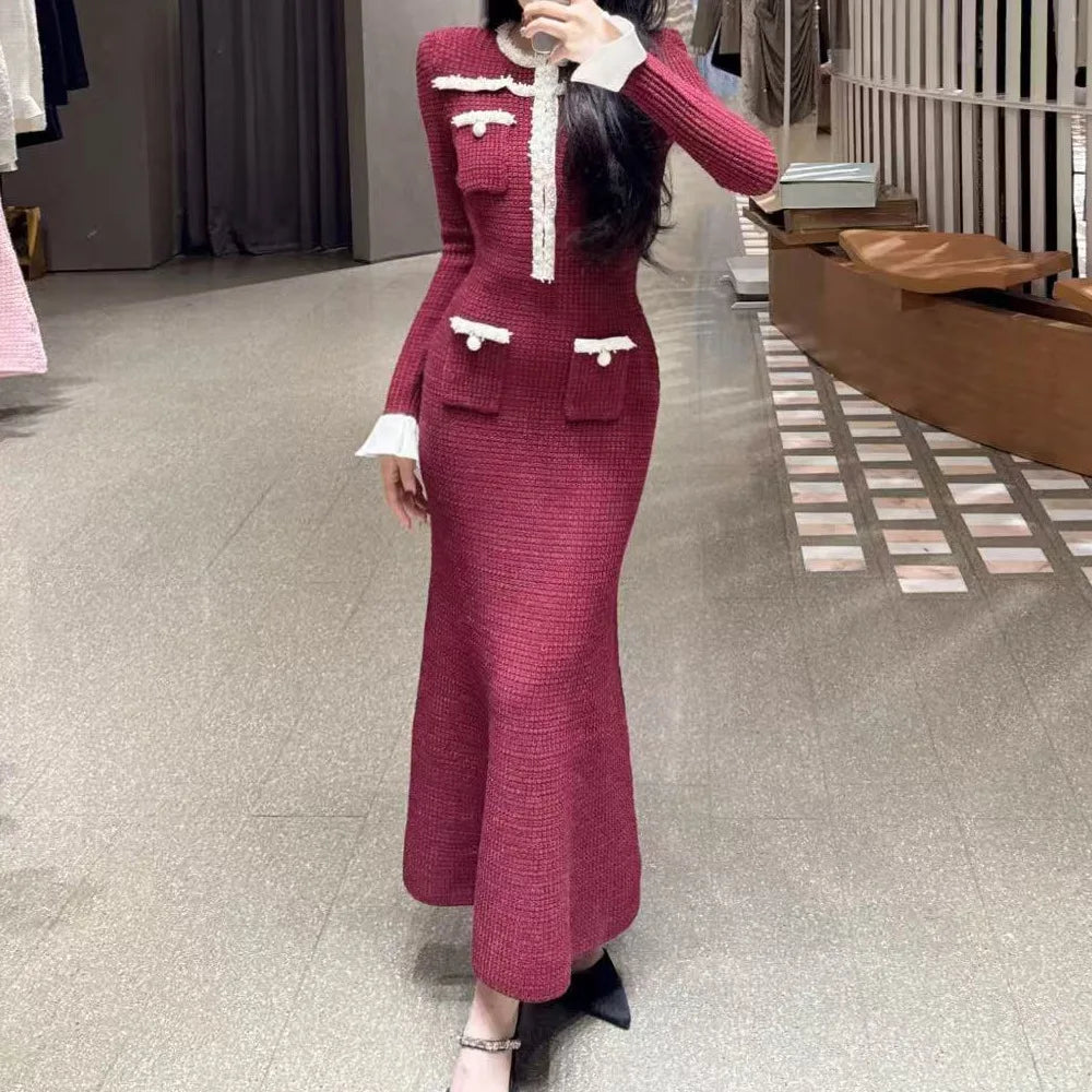 2025 Burgundy Knitted Slim Fit Long-Sleeved Women's Dress, Round Neck, Elegant Chic Woman Evening Dress